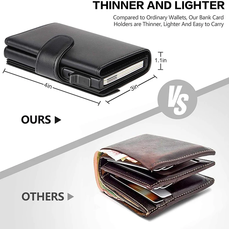 Wallet Size 10*7.6*2.5cm(4*3*1 inch).In the wallet can hold 7-9 cards in total, there is an aluminum alloy card box., two independent card compartments and a banknote compartment. The card box consists of three layers of reflective aluminum foil. Can block high frequency signals such as rfid . You can place more important cards in the independent card slot or place some bills in the bill compartment. Cards and banknotes can be removed anytime! What a pleasant thing!